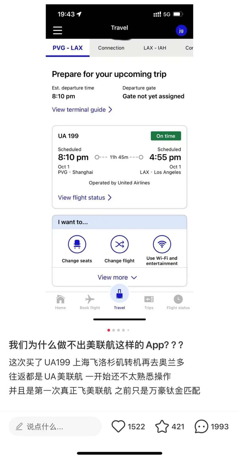 根據該網友的消息顯示,其是10月1日搭乘美聯航UA199航班,從上海洛杉磯(专题),再轉機到休斯頓(专题),最終目的地是佛羅裡達州的奧蘭多,總共三趟航班。