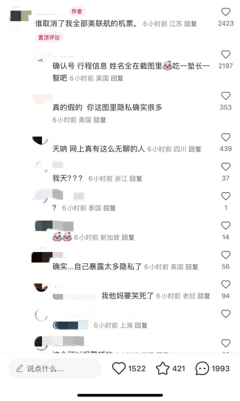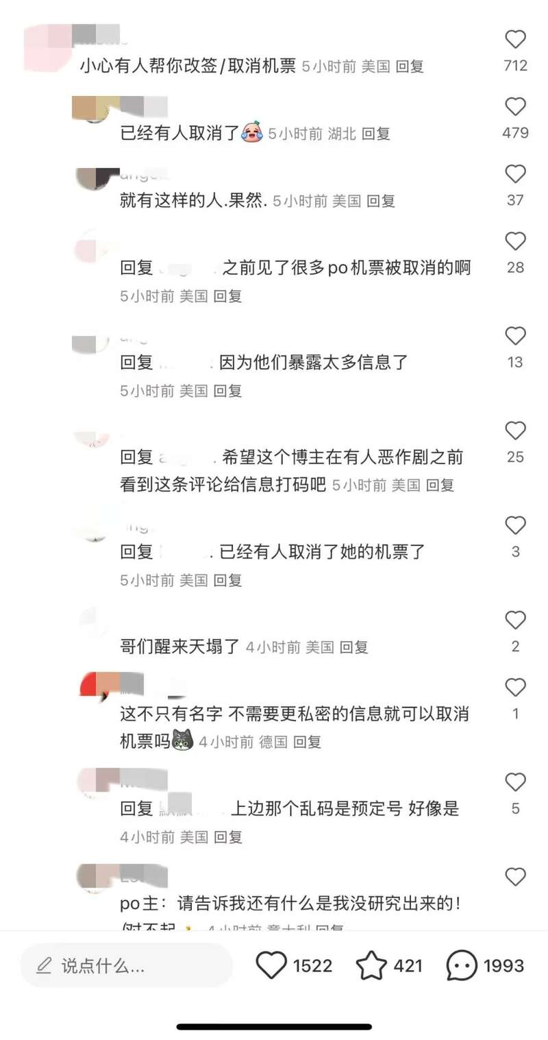 有網友立刻在評論區提醒:“小心有人幫你改簽/取消機票”。