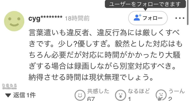 “對違規者、違規行為在用詞上也應該更加嚴格。現在稍微有些過於溫和。當然,必須采取堅定的態度,但如果處理耗時過長或者引發騷動,就應該一邊錄像一邊帶到單獨的房間處理。要讓對方心服口服,以目前的狀況來說是不可能的。”