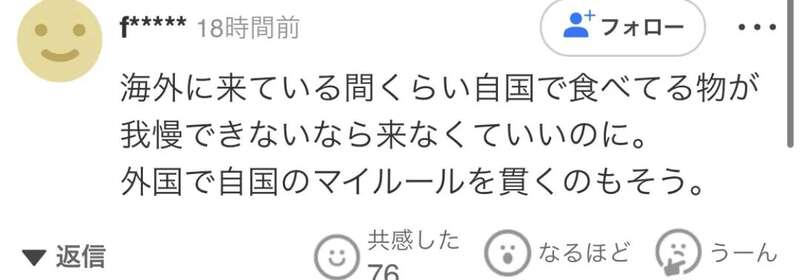 “既然都出國了,那還吃什麼在本國常吃的東西,受不了幹脆別來。在外國還要堅持本國的我行我素,無法理解。”