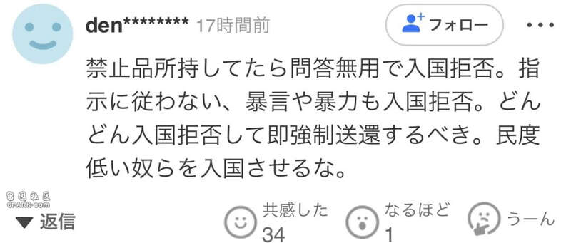 “如果攜帶違禁品就一律拒絕入境。不服從指示、口出惡言或施暴的也要拒絕入境。應該不斷拒絕入境並立即強制遣返。別讓那些素質低下的人進來。”