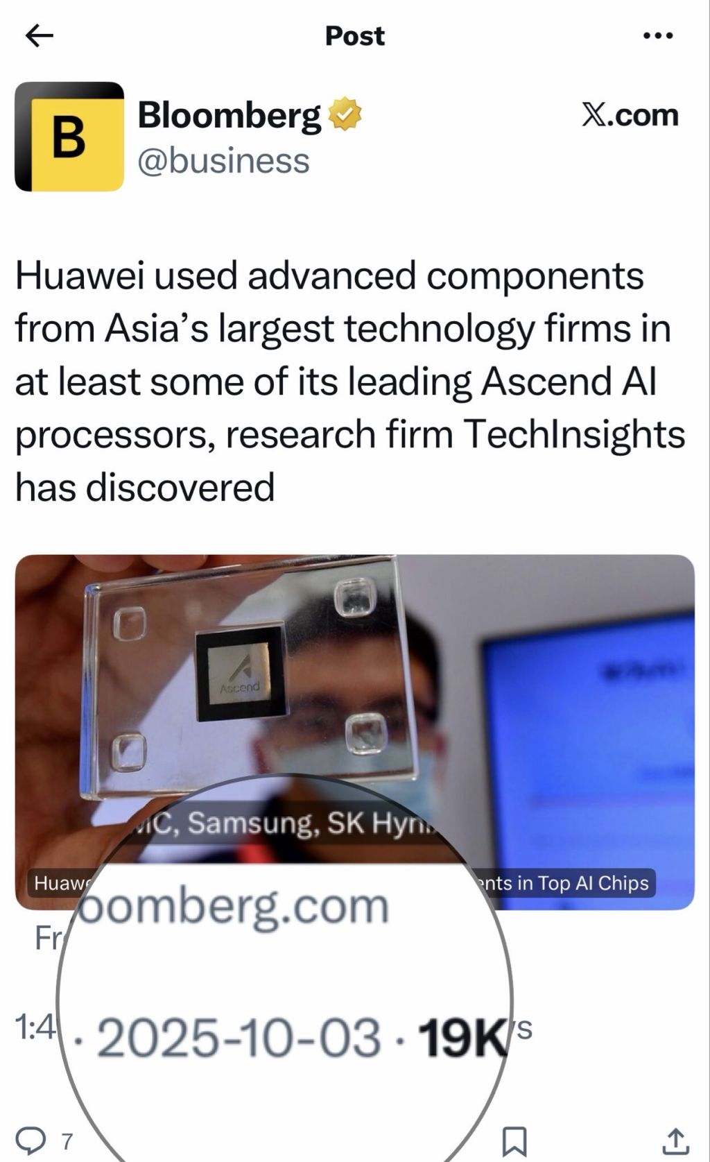 彭博(Bloomberg News)報導,加拿大(专题)研究機構TechInsights發表聲明指出,拆解華為昇騰910C(Ascend 910C)處理器的多個樣本過程中,發現來自台積電、三星電子以及SK海力士的零組件。