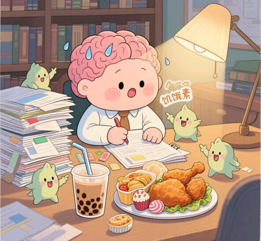 当大脑长时间高强度工作时,会分泌“饥饿素”,让你特别想吃高糖、高油的食物(比如奶茶、炸鸡)——这些食物能快速给大脑补充葡萄糖,缓解疲劳。但一杯奶茶的热量(约300-400大卡),需要你连续算3-4小时高数才能消耗掉,显然得不偿失。(外卖是00后的红利)
