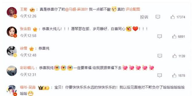 李纯这边,王菊留言 "终于等到这一天,下次聚会要喝喜酒",张含韵还晒了两人以前的合照,说 "我的女孩要一直幸福"。