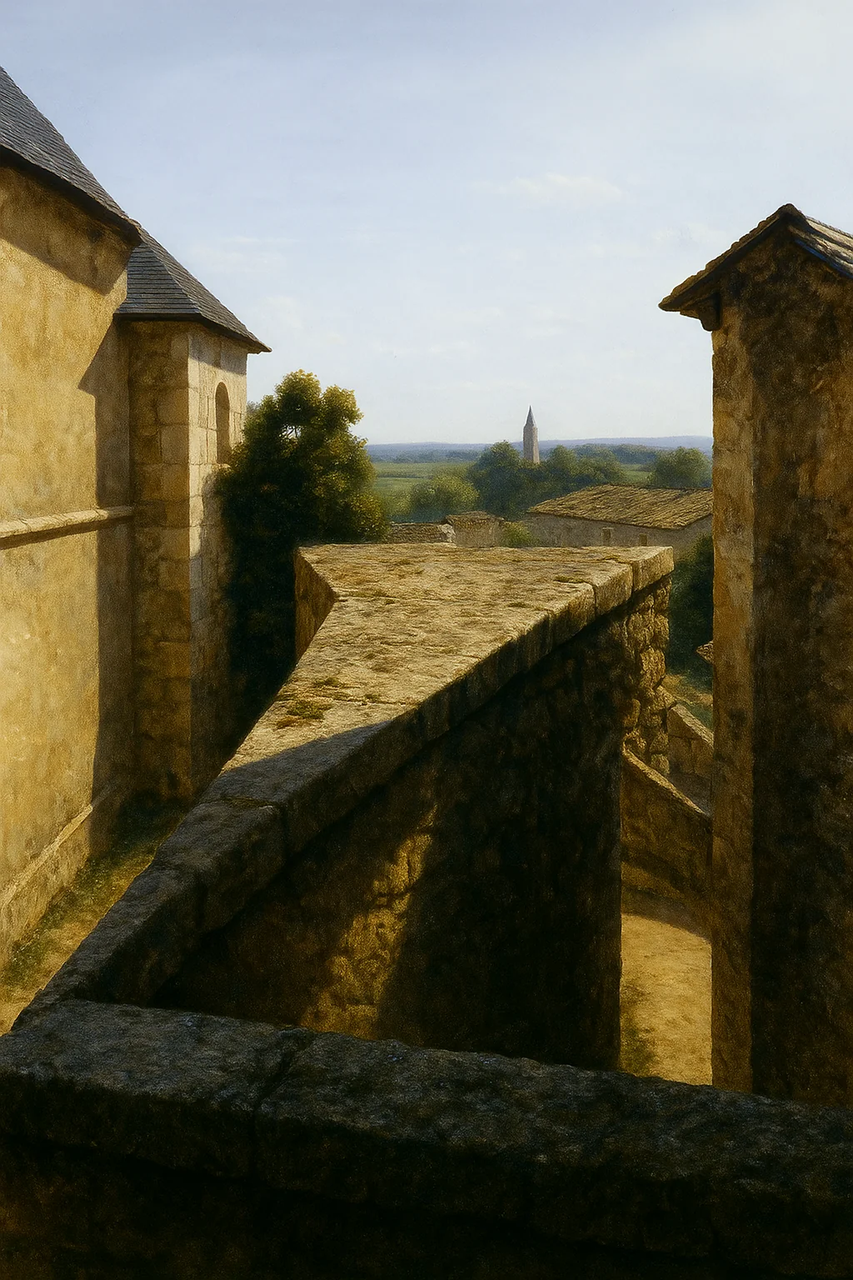 相比 GPT-4o,《勒格哈的窗外景色》在 Flux 模型的復原中,被處理成了一座被遺棄的歷史遺址,屋頂只剩下零星紅瓦,仿佛早已被風雨和時間掏空。
