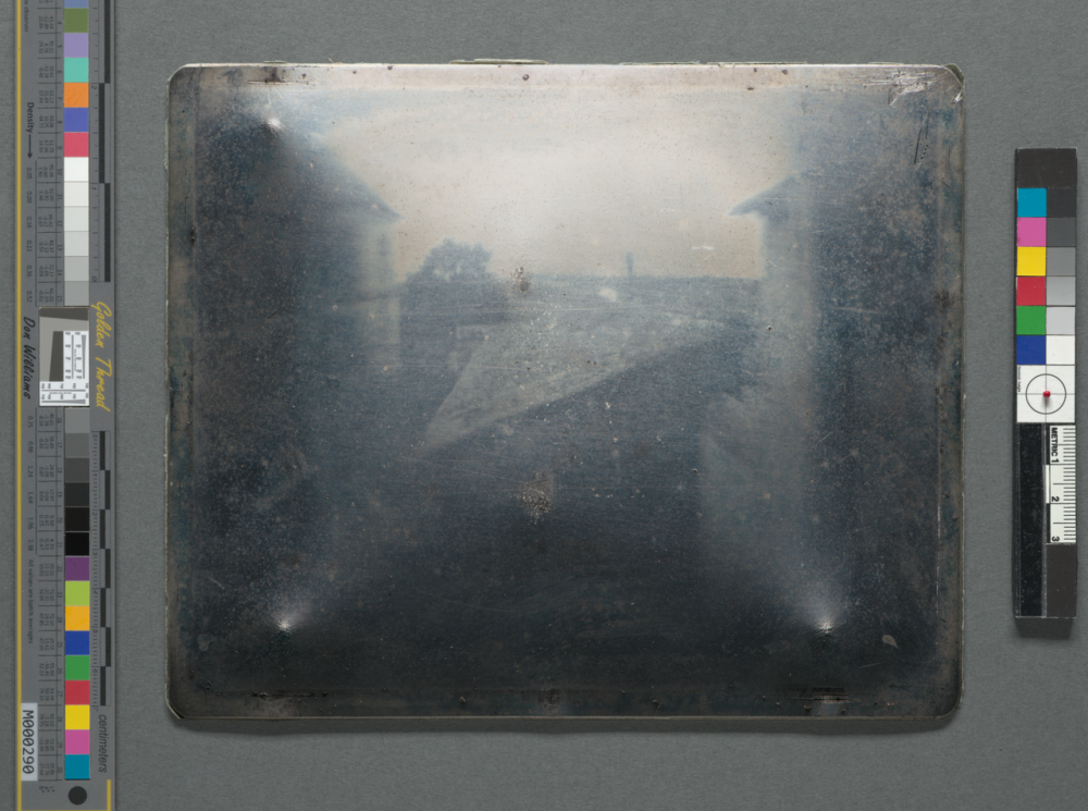 照片的作者尼埃普斯站在自家二樓的工作室窗邊,架好鏡頭,對准庭院和遠處景色,連續曝光幾天,才在一塊拋光錫板上捕捉到這段模糊而珍貴的影像。