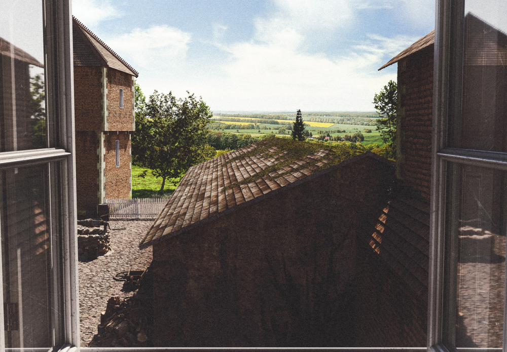 實際上,當中那塊三角形亮斑,並不是建築結構,而是庭院地面在長時間曝光下,被陽光照射後留下的亮斑。圖像左右是莊園的建築牆面,遠處依稀可見的則是一棵樹和農田的地平線。