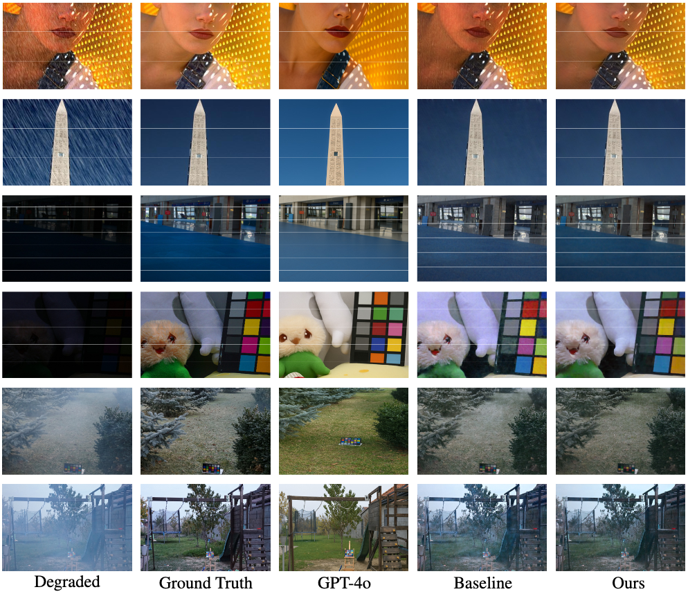 北京理工大學與澳大利亞國立大學今年聯合發布了關於 GPT-4o 圖像修復能力的實驗結果。研究團隊采用了一種直覺式方案:將退化圖像輸入 GPT-4o,提取語義特征並疊加其「修復建議」,生成最終圖像。