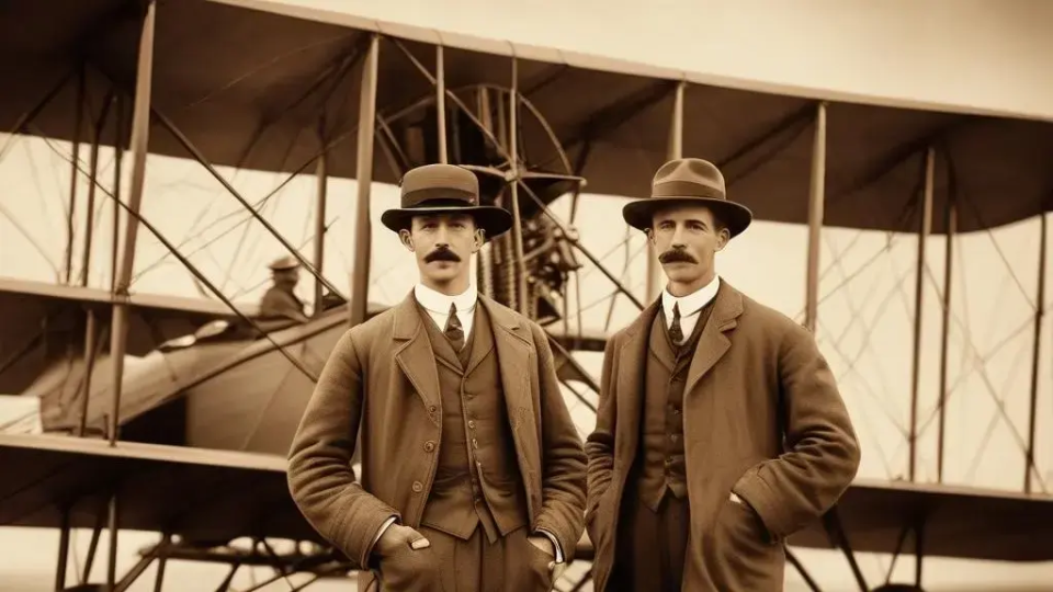 類似的還有一張號稱萊特兄弟首次動力飛行的。畫面中兩名年輕男子站在一架古董雙翼飛機前,表情神情自若。但對照歷史檔案,這同樣是張假照片。