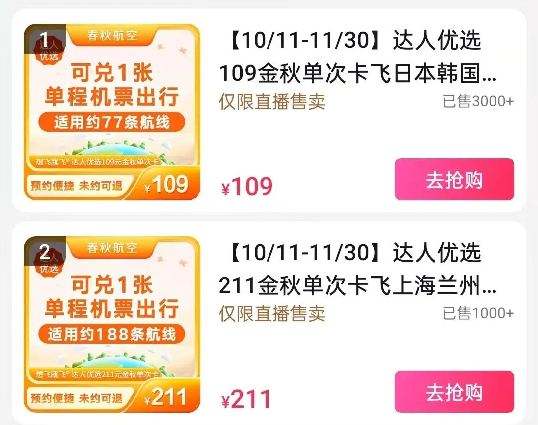 近来,她又囤了几张深圳航空、四川航空、东方航空、南方航空的次卡。张萍觉得从直播间买机票次卡的优点,一是价格确实比OTA平台便宜,二是只要没成功兑换都可以全额退款。