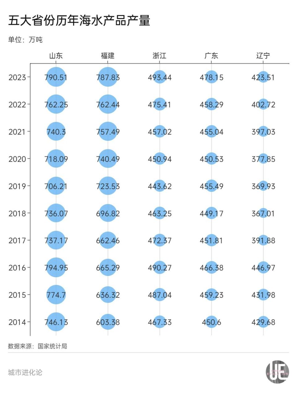 但若从产量来看,真正的“海鲜大省”另有其名。根据国家统计局数据,山东2023年以790.51万吨的海水产品产量,稳居中国海鲜产量榜首。