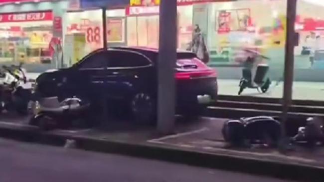 網傳視頻顯示,一輛黑色轎車在街邊非機動車道緩慢行駛,接連撞倒左側多輛電動單車,然後又“游蕩”到右側,撞到路邊的車棚。最後,車子疑似被東西擋住,才停了下來。