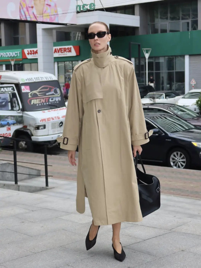 廓形被放大,肩线自然下坠,腰带不再束紧,而是随意地垂落在身侧。