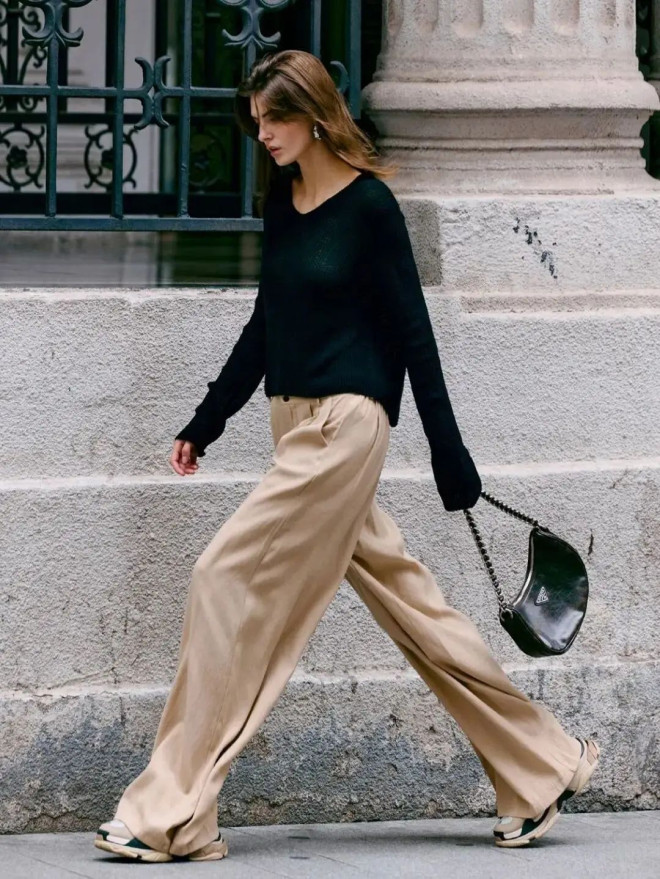 低重心的跑鞋、网球鞋或复古训练鞋,配风衣、阔腿裤、针织裙都能自然成型。