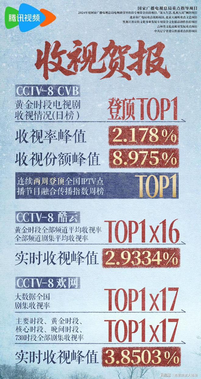 自開播CCTV8實時收視峰值達2.887%,登頂黃金時段劇集TOP1。騰訊視頻站內熱度破25700,抖音話題播放量超20億。