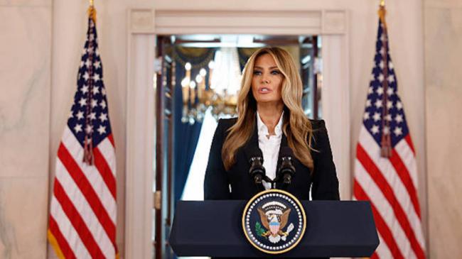 第一夫人梅拉尼娅·川普于2025年10月10日在华盛顿特区白宫大厅发表演说。第一夫人宣布,她与俄罗斯总统弗拉基米尔·普京已建立“开放的沟通管道”,以帮助因俄乌战争而流离失所的乌克兰儿童与家人团聚。 (Kevin Dietsch/Getty Images)