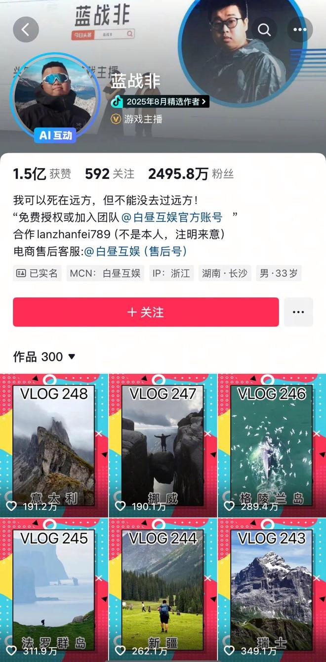 數據顯示,藍戰非抖音賬號被禁止關注前,粉絲數量為2494萬,掉粉38萬。其余快手、小紅書、嗶哩嗶哩等平台賬號也均有掉粉。目前,藍戰非抖音、微博、快手,小紅書、嗶哩嗶哩賬號已恢復正常。