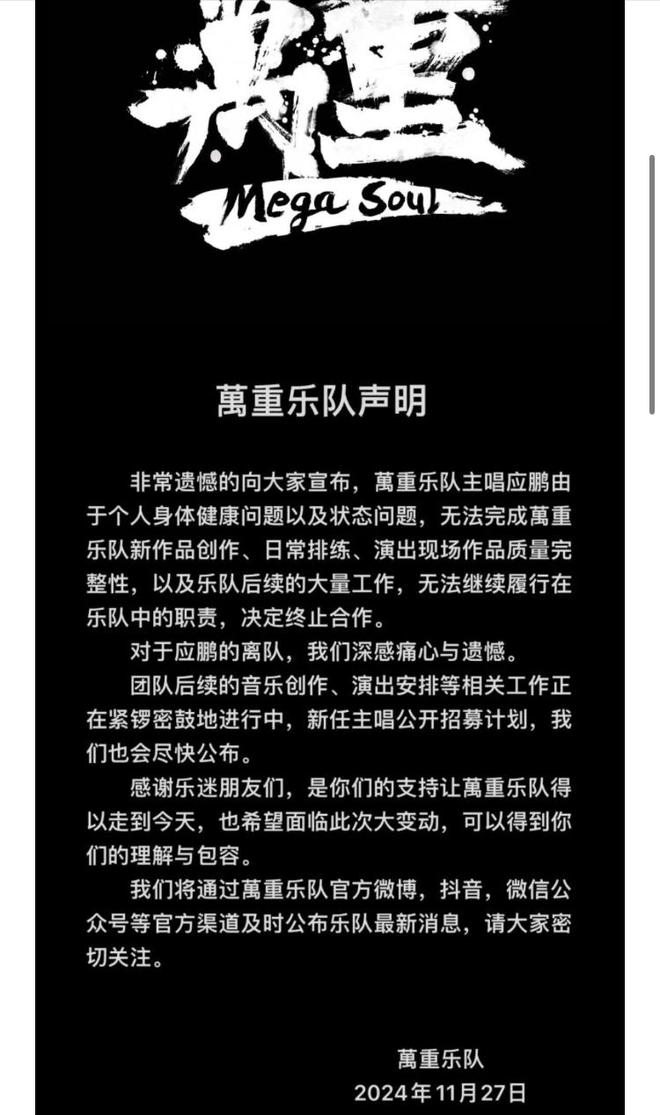 2024年11月,他离开了万重乐队,当时万重乐队发布的声明中写道应鹏因为疾病,身体已经完全无法行动。