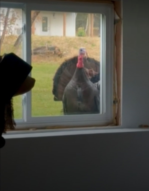 可以看到其中一只火鸡用头多次“敲击”窗户,似乎想进入窗户。