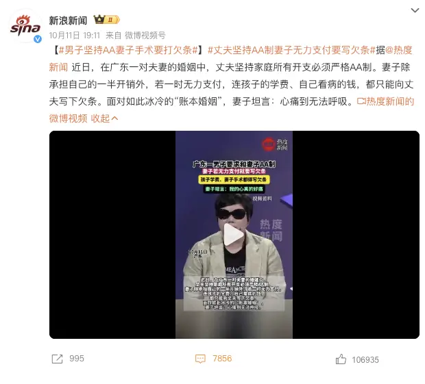 近日,“男子坚持AA妻子手术要打欠条”话题登上热搜,引发大量讨论。
