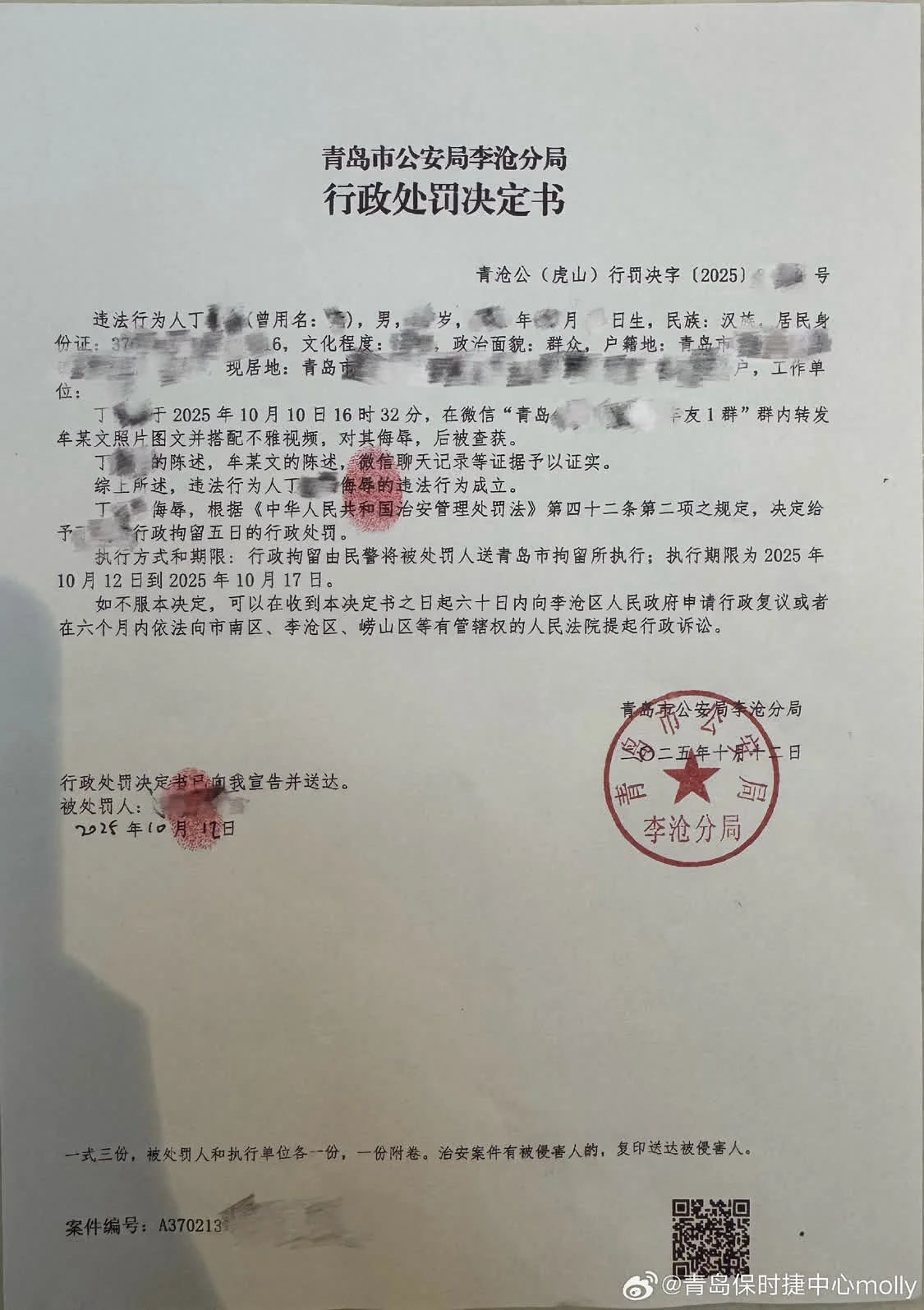 12日牟女士發布的青島市公安局李滄分局行政處罰決定書,主要是對違法行為鏈條中傳播者丁某的處罰決定。決定書內容顯示,2025年10月10日丁某在一微信車友群內轉發牟女士照片圖文並搭配不雅視頻,對其侮辱,後被查獲。根據《中華人(专题)民共和國治安管理處罰法》第四十二條第二項規定,給予丁某行政拘留五日的行政處罰。