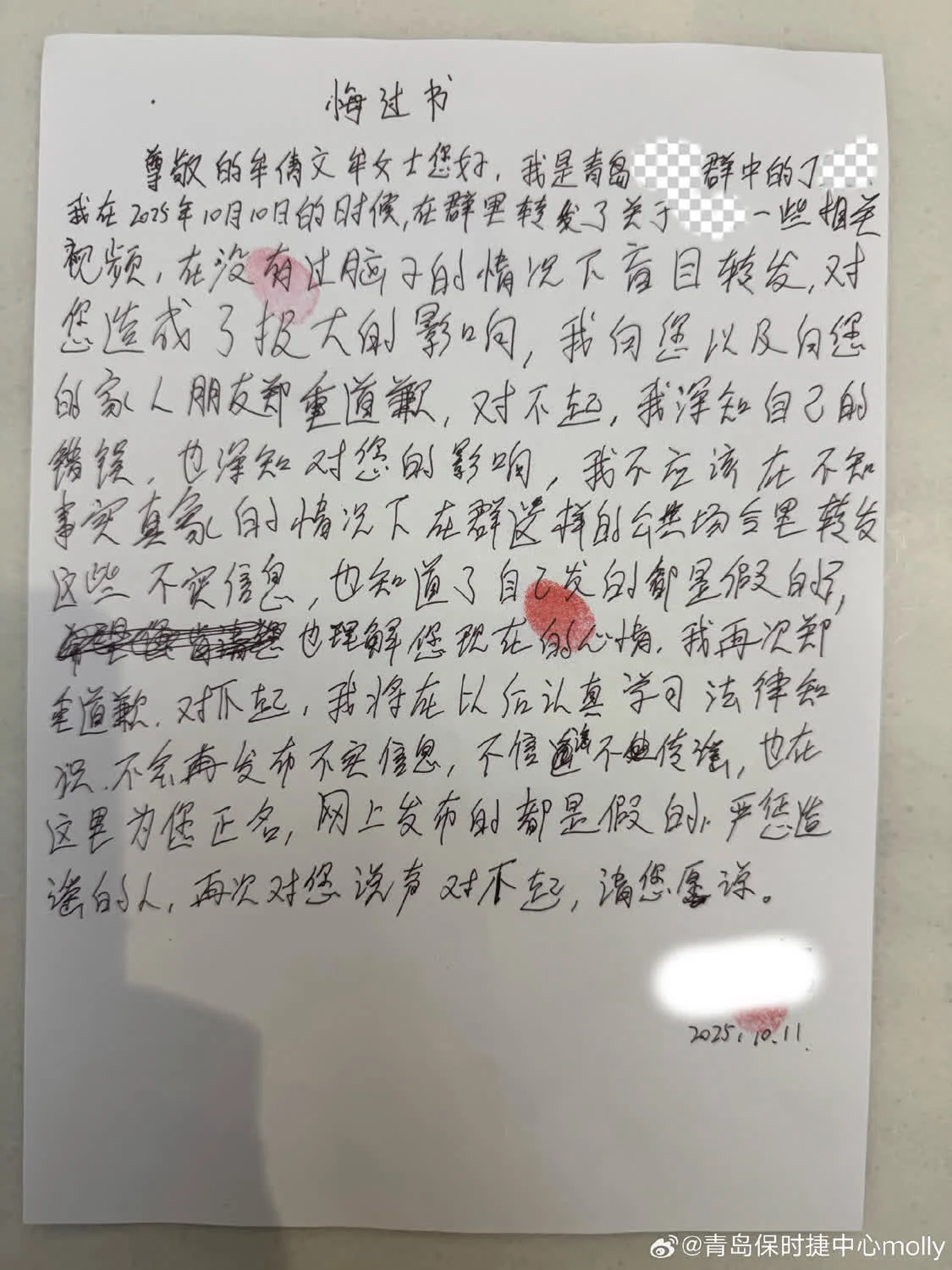 違法行為人丁某在11日寫下悔過書,承認自身錯誤並向牟女士道歉。但牟女士報案並啟動法律程序追究所有涉案人員民事及刑事責任,直接進行AI合成圖文與視頻的違法者暫未抓獲。牟女士表示,相關案件已正式進入司法程序,交由警方依法處理。