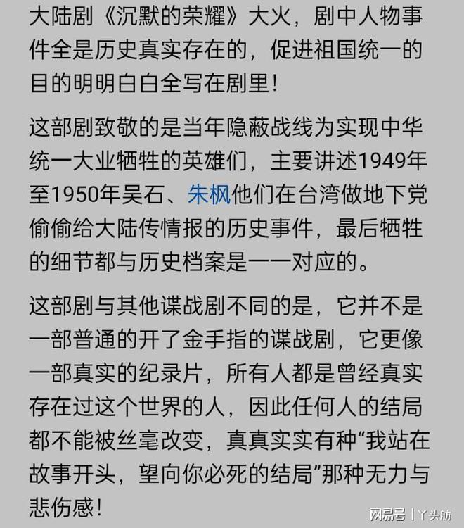 還有博主發帖稱,《沉默的榮耀》劇中人物全事件全是歷史真實存在的,促進祖國統一的目的明明白白全寫在劇裡,這部劇致敬的是當年隱蔽戰線為實現中華統一大業犧牲的英雄們。