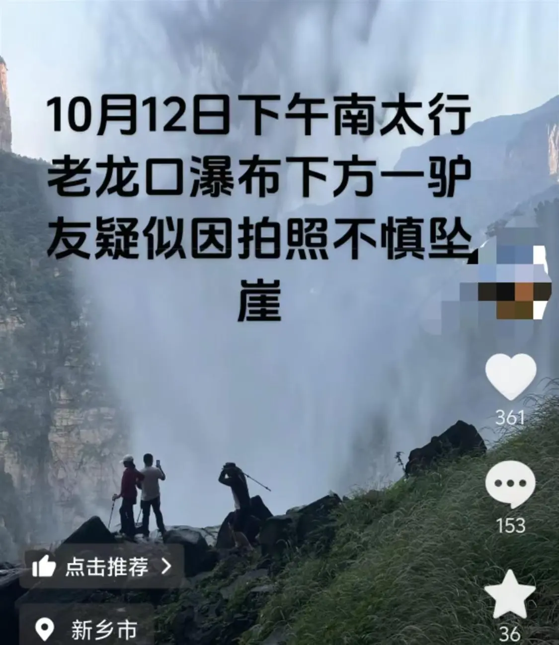 10月12日,有网友发视频称,当日下午在位于河南新乡辉县的南太行老龙口瀑布下方,一男驴友疑似因拍照不慎坠崖。13日,该驴友同行者告诉极目新闻记者,12日下午5时30分许,该男子正在悬崖边拍照,不慎坠崖,辉县上八里派出所一名工作人员回应极目新闻记者,当地正组织救援人员搜救,人还没有找到,其他情况不方便透露。