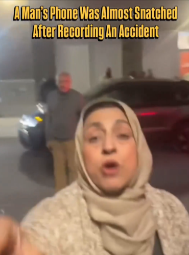 当时前面被撞的车正在驶离一段距离,拍摄视频的人正在拍摄当时的情景,这时一名身穿黑色衬衫和棕褐色头巾的女子意识到有人在拍摄。