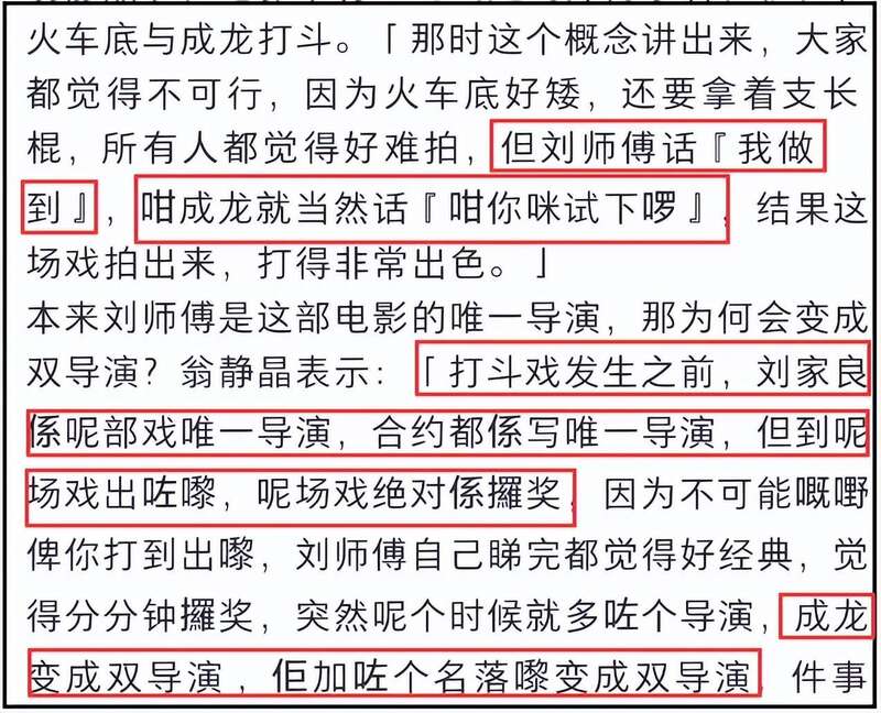 翁静晶透露,当时要拍摄一段在火车底持长棍打斗的戏,所有人都觉得难度很大,但刘家良坚持一试,后来效果很精彩,大家一致觉得可以拿奖。而成龙看到精彩镜头后,立即将自己名字加入联合导演名单,这种行为明显是抢功。