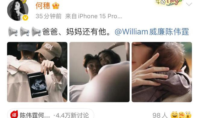 夫妻俩在社交平台使用相同文案宣布喜讯,并用“他”来透露宝宝性别,与何穗相恋6年,终于圆满了。