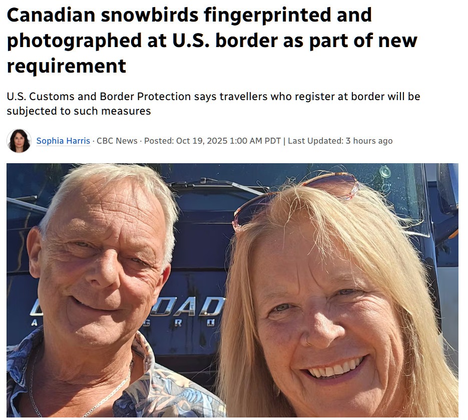 (加西网综合)每年秋冬季,加拿大雪鸟族都要到美国温暖地区过冬,近日,部分雪鸟族报告说,本月他们在加美边境登记冬季居留时被采集指纹并拍照,美国海关和边境保护局 (CBP) 称,这现在是标准程序。