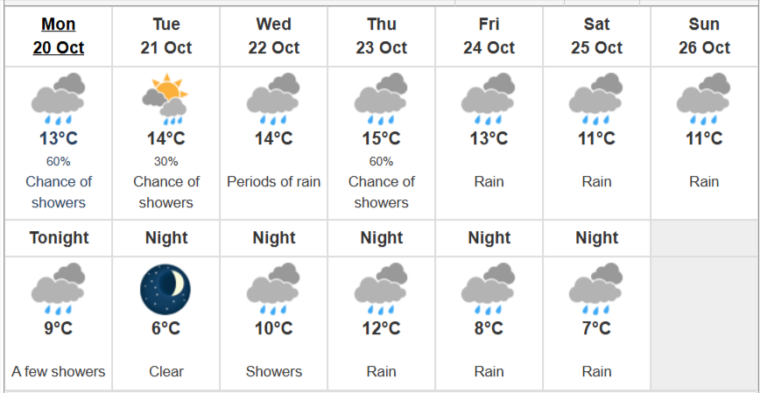 預計最高氣溫為 15 攝氏度,但不會是晴朗的 15 攝氏度,因為預計白天和夜間都會有降雨。