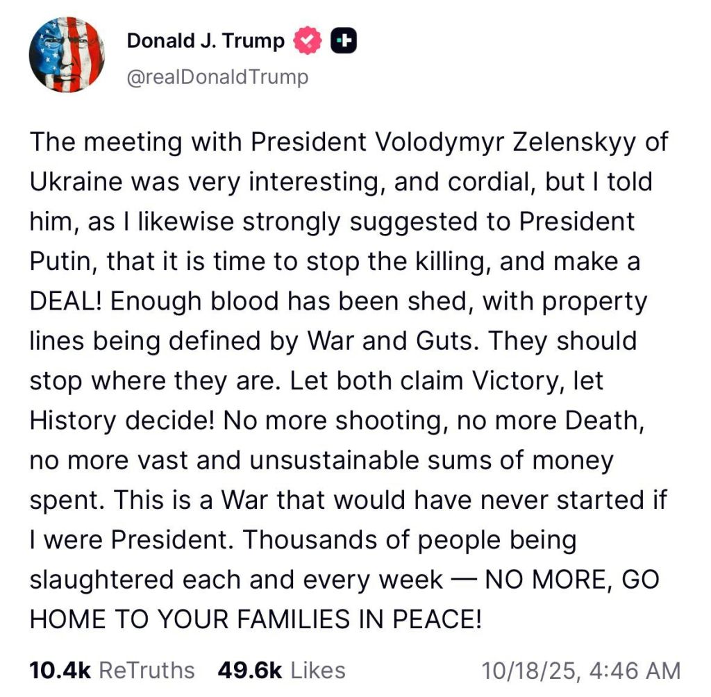 在見過澤連斯基之後,川普在Truth Social上表示:“他們應該在他們所在的地方停止,讓雙方都宣稱勝利,交由歷史判斷(勝利誰屬)!”(網站截圖)