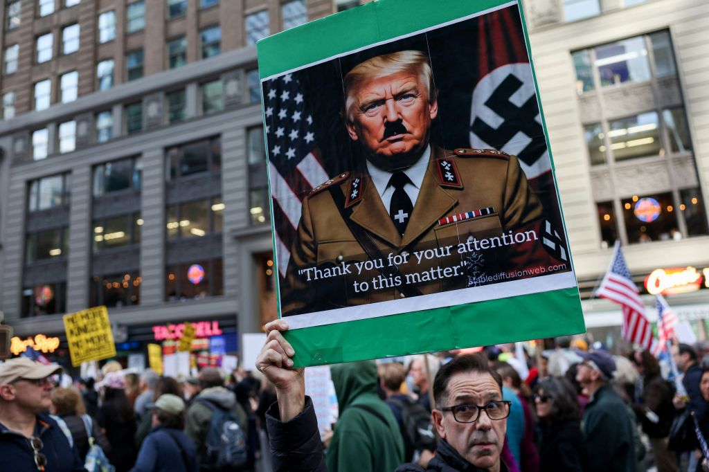 2025年10月18日,美國紐約市時報廣場(Times Square),人們參加“拒絕國王”(No Kings)示威活動,抗議總統川普(Donald Trump)施政。圖為一男子舉著印有川普身穿納粹服飾形象的標語牌。(Reuters)