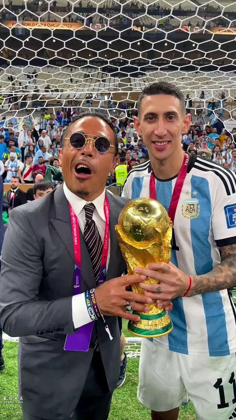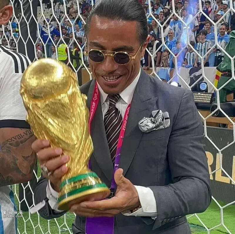 2022年世界杯决赛,阿根廷夺冠时刻,Salt Bae突然闯入球场,强行搂抱梅西、亲吻奖杯,甚至干扰庆祝活动。
