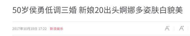 参考资料: 新浪娱乐《50岁侯勇低调三婚 新娘20出头婀娜多姿肤白貌美》