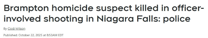 今天(10月22日),尼亚加拉警方在上午表示,一名涉嫌于周二在安省宾顿(Brampton, Ont.)商场枪杀一名女性并劫走1岁女童的嫌犯,被警方发现后当场击毙。