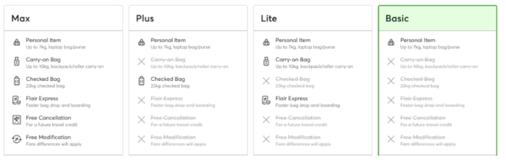 旅客还将陆续体验 Flair 航空全新推出的票价组合方案,该公司将提供 Basic 基础版、Lite 精简版、Plus 增强版、Max 豪华版四种选项,旨在让乘客更好地掌控自己的支付方式。