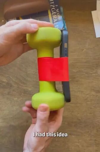 其次,這個啞鈴很容易擋住他的手機攝像頭,感覺拍啥都像“偷拍”。