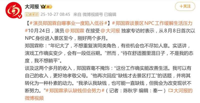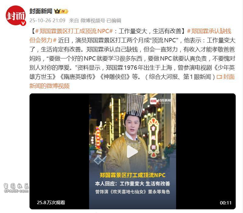 更引人注意的是,郑国霖主动打破了“明星高高在上”的刻板印象。他直言:“工作没有贵贱之分,只有努不努力。”在景区扮演唐太宗李世民,被他视为一份正经职业——凭劳动赚钱“不丢人,丢人的是不努力”。面对NPC身份,他同样敬业:“要做一个好的NPC就要学习很多东西,要认真负责,不要愧对别人对你的厚爱。”
