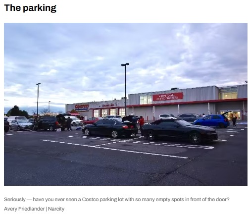 在我常去的普通 Costco,停車簡直是一場災難。哪怕早上九點開門時到達,停車場依然爆滿。你繞圈無數,剛看到空位,就會有幾十輛車從天而降搶先一步。