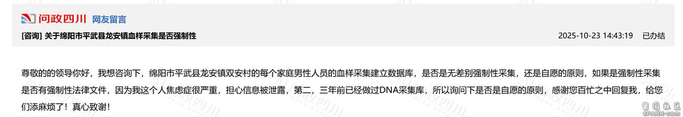 澎湃新闻注意到,10月23日,四川省平武县一位居民在问政四川平台咨询,该县龙安镇双安村每个家庭男性人员血样采集,建立数据库,是强制性采集还是自愿的原则?是否有相关法律文件依据?该居民表示,他担心其信息被泄露。而且当地在三年前已经做过DNA采集。