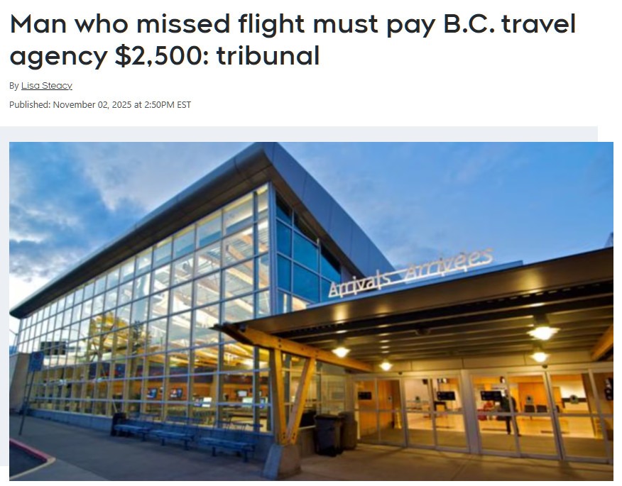 (加西网综合)BC省一家仲裁庭裁定,一名男子虽然因错过航班而获得了航空公司的退款,但最终还是要支付他从未乘坐过的那次旅行的费用。