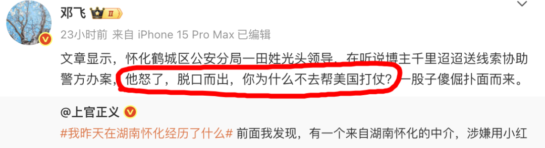 结果没想到,事情办完之后,当天下午城南区派出所所长转头说举报人上官正义违法了,“强制收了他两部手机,派专人看管他”。上官正义迫于无奈,借上厕所的机会,用裤兜里藏住的最后一部手机,在网上发信息“请求大家关注”。网上舆论开始传播,当天晚上,上官正义又发文感谢网友的关注和关心,已平安离开怀化市。