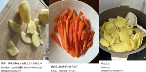切丝、切片、切丁、滚刀块等切法,更是犹如考研一般,明明眼睛看会了,偏偏手就是不听使唤,切丝能切成块、切片能切成牛排状,哪怕有刨丝器相助,也能刨成厚薯片。