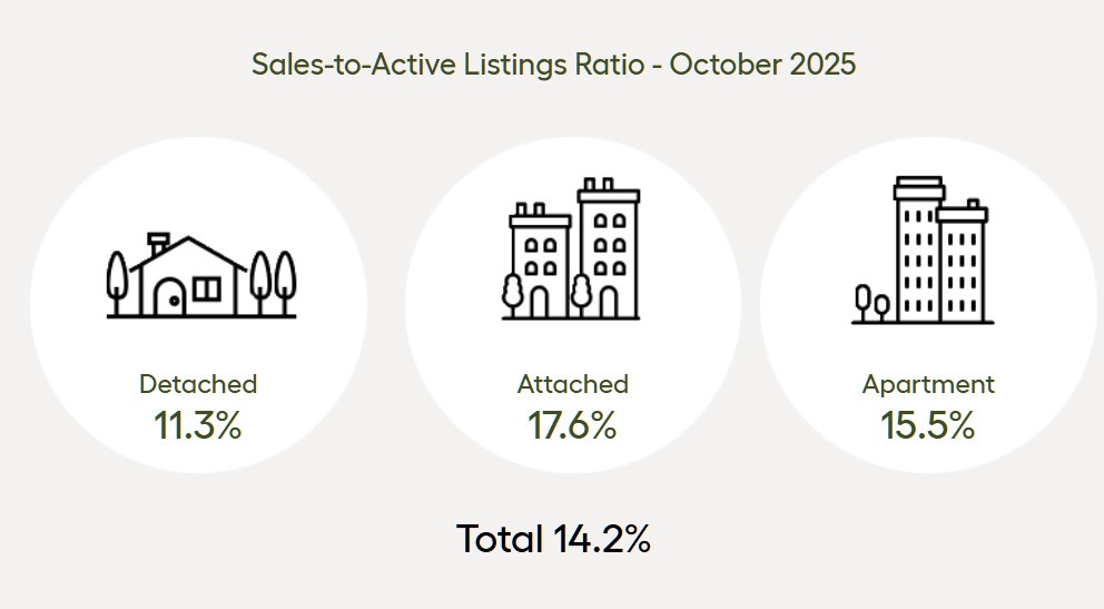 2025年10月,所有獨立式住宅、聯排住宅和公寓的銷售與活躍掛牌房源比率為14.2%。按房產類型劃分,獨立式住宅的比率為11.3%,聯排住宅為17.6%,公寓為15.5%。