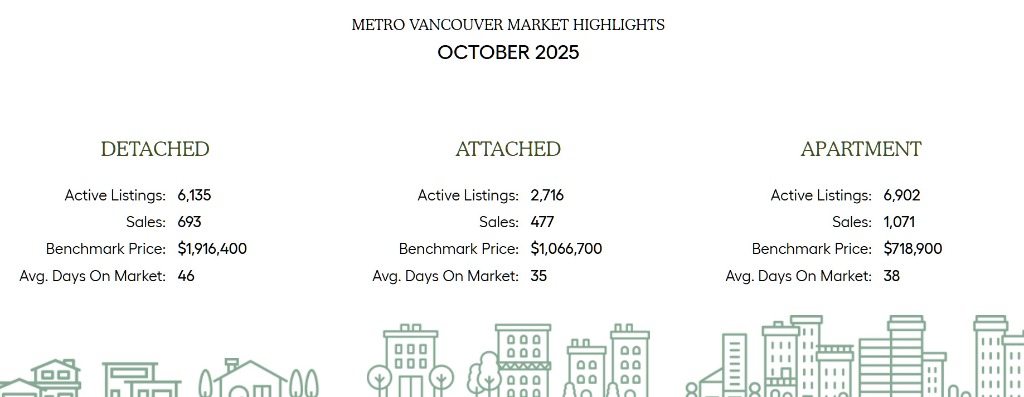 大溫地產經紀人協會 (GVR) 報告稱,2025 年 10 月該地區住宅銷售總量為 2,255 套,比 2024 年 10 月記錄的 2,632 套銷售量下降了 14.3%。這比 10 年季節平均值 (2,638 套) 低了 14.5%。