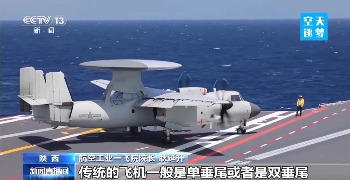 总台央视记者 李宁:在我身边的这个就是我国第一型固定翼舰载预警机——空 警-600,它是航母编队的“千里眼”,同时也是“司令部”。它的成功研制也标志着我国海军作战能力得到了质的提升。