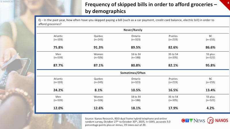 此表按人口统计特征列出了为购买食品杂货而拖欠账单的频率。数据来源:Nanos Research